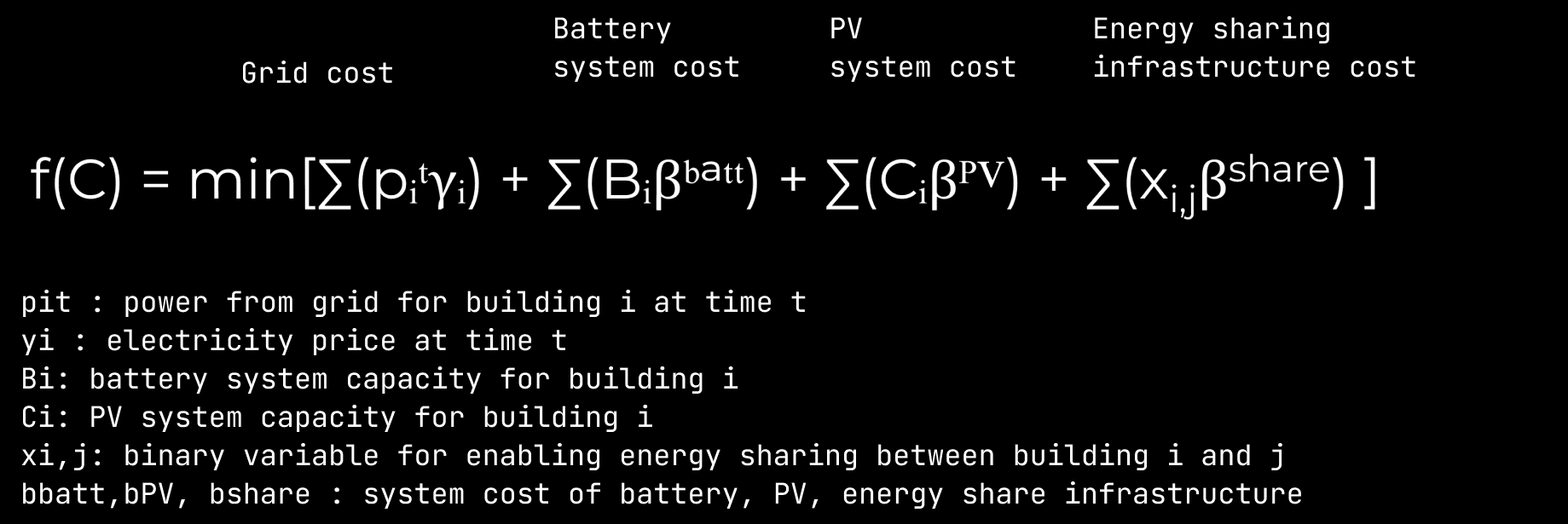 Optimization algorithm minimizes total infrastructure cost required to deploy and operate a multi-building energy-sharing network. It determines both where and how much to install for PV and battery systems, and energy-sharing connections between buildings.