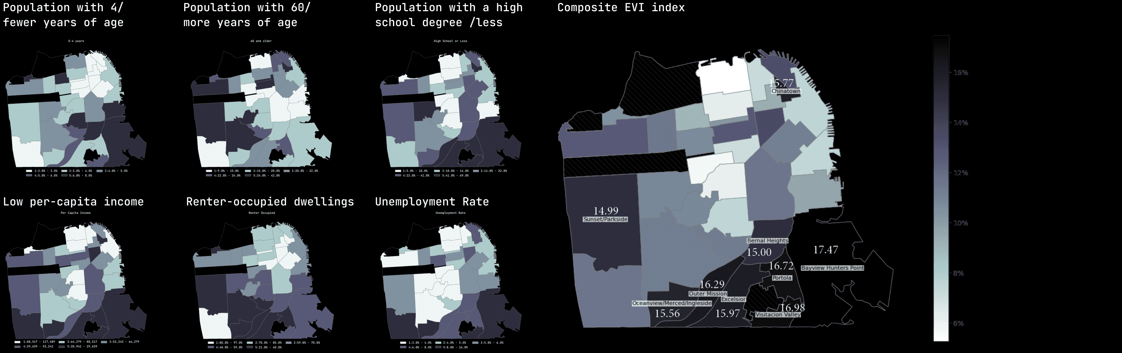 The Energy Vulnerability Index (EVI) was developed to measure a population’s vulnerability to power outages. Each of the six demographic criteria that composes EVI is scaled from 1 to 5, with 1 being the best, and 5 being the worst. The maps below illustrate the spatial distribution for San Francisco of each EVI criteria, with darker colors indicating more severe conditions.
