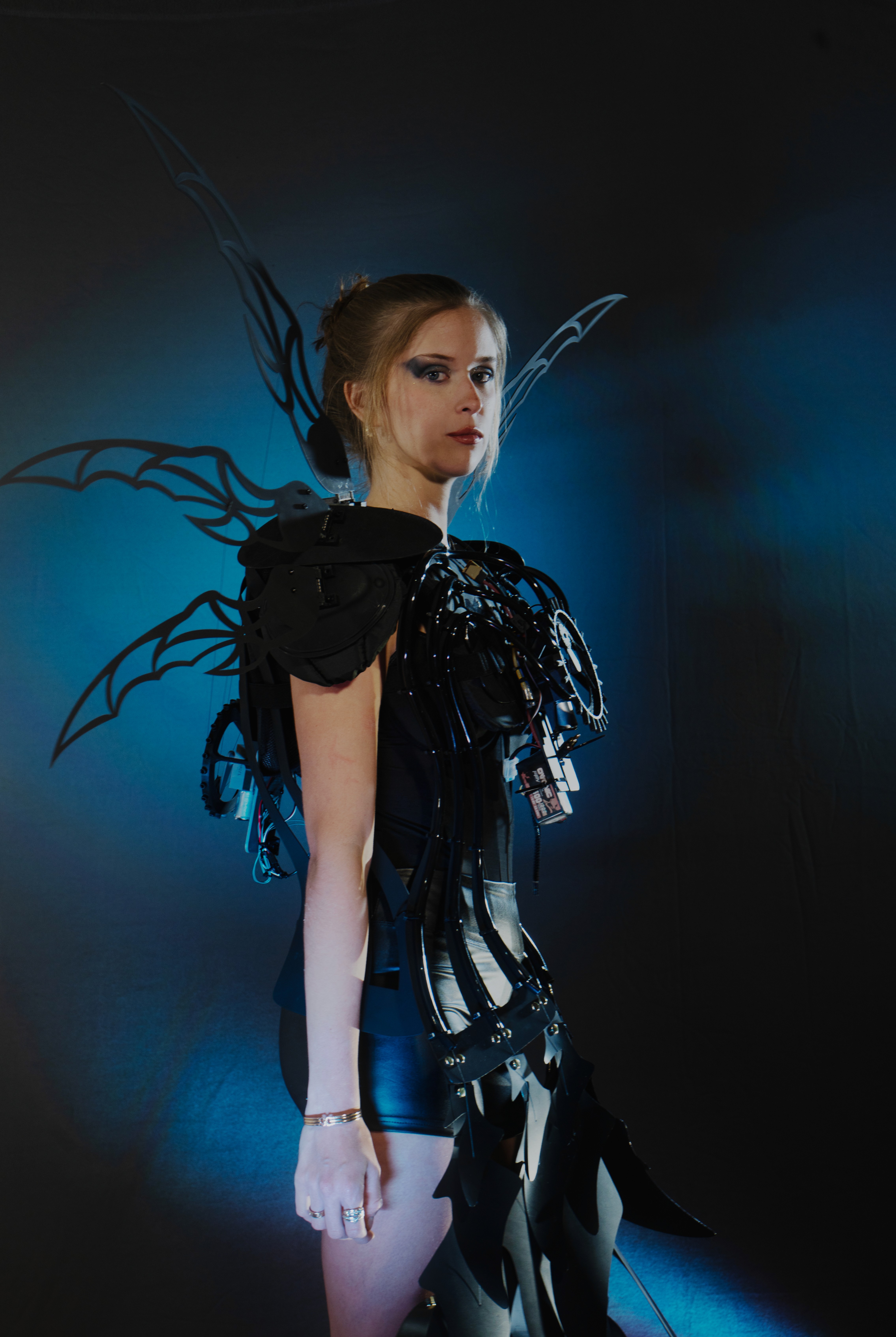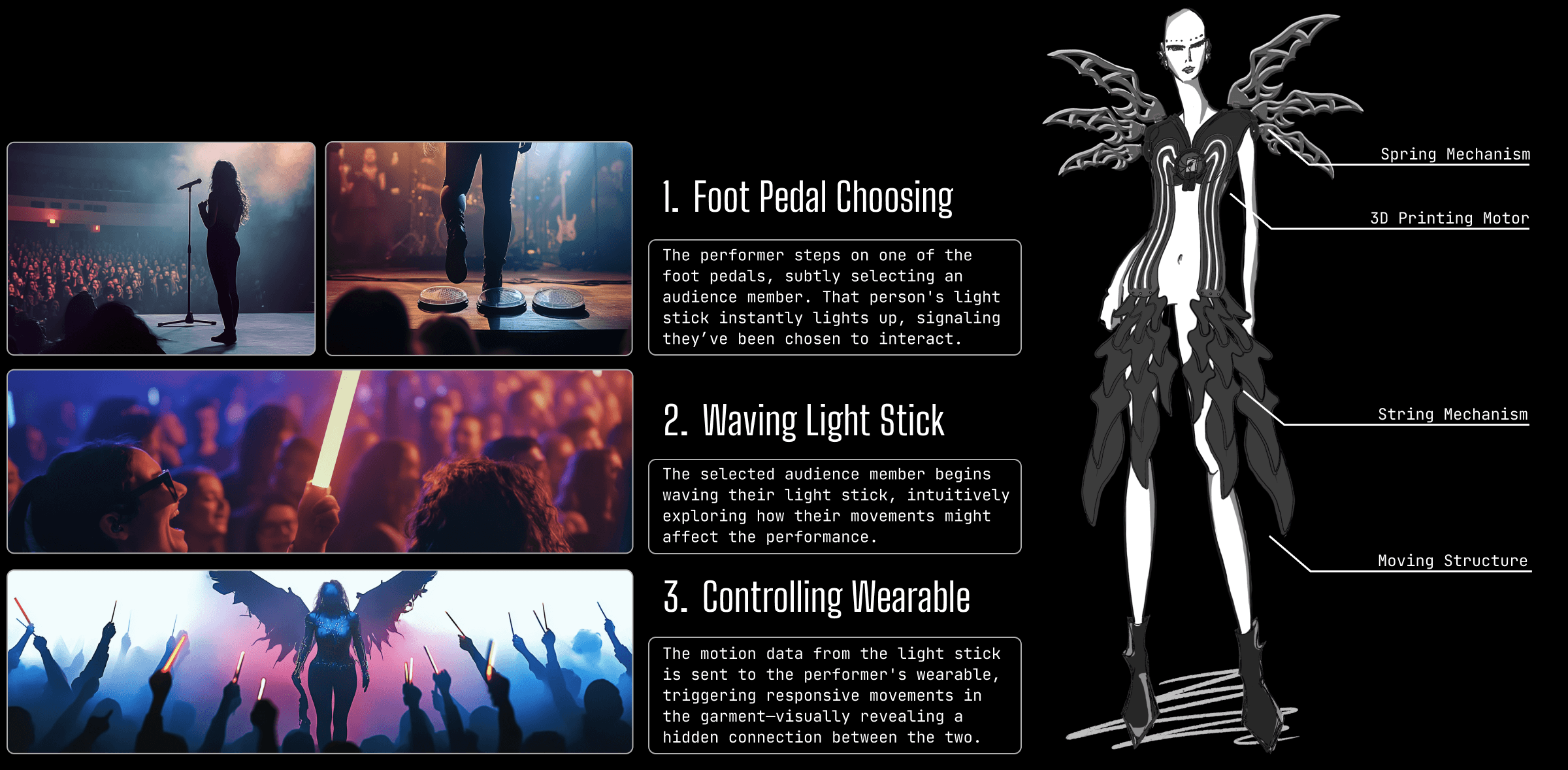 This interactive wearable project explores dynamic performer-audience interaction, enabling real-time audience participation through motion-responsive technology. The audience's gestures directly influence the wearable’s kinetic movements, creating a mutual and immersive performance experience.